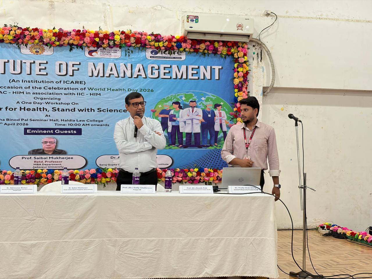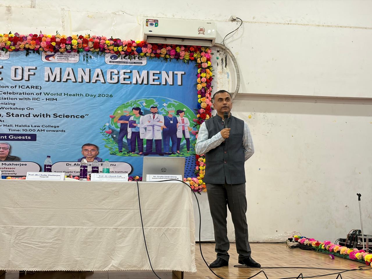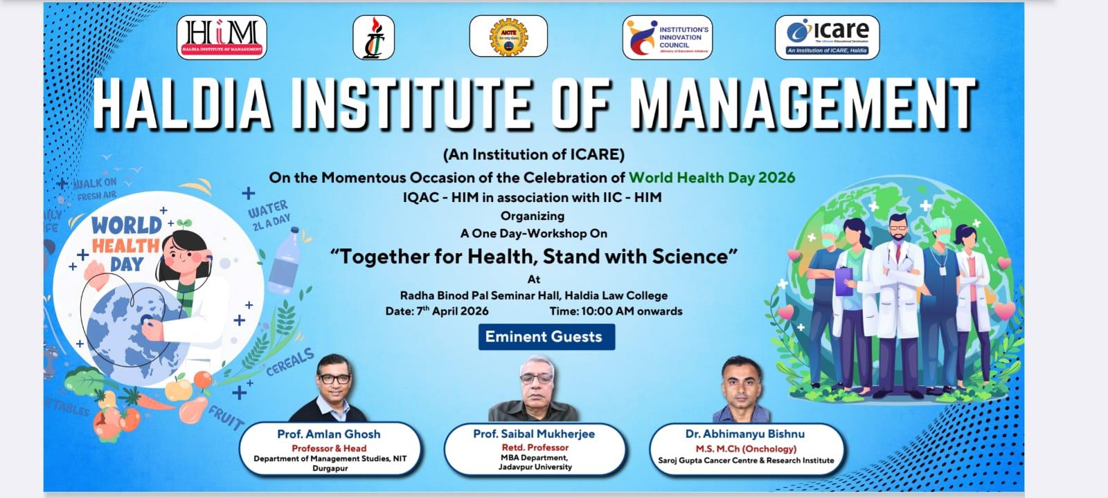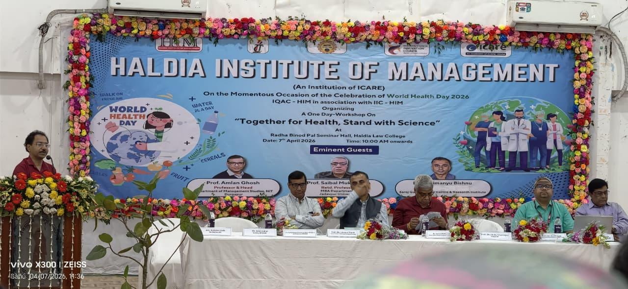 World Health Day 2026 was observed on 7th April with a meaningful workshop on the theme “Together for Health, Stand with Science”, organized by IQAC - HIM in association with IIC - HIM. All first-year students from every department attended the session and actively engaged in discussions on health awareness and scientific responsibility. The workshop featured distinguished speakers - Prof. Amlan Ghosh, Professor & Head, Department of Management Studies, NIT Durgapur; Prof. Saibal Mukherjee, Retired Professor, MBA Department, Jadavpur University; and Dr. Abhimanyu Bishnu, M.S., M.Ch (Oncology), Saroj Gupta Cancer Centre & Research Institute - who shared valuable insights on building a healthier and informed society.